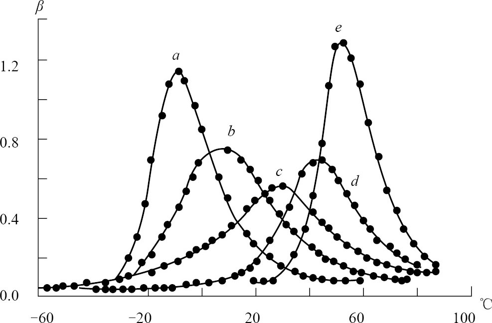玻璃化转变温度 T g 是黏弹性阻尼材料最重要的性能参数之一。但是,一般材料,尤其是单组分材料,其 T g 多数出现在负温的情况,如氯化丁基硫化橡胶(硬度为30HA时)的 T g =-9℃( β =1.47),氯丁硫化橡胶(硬度为60HA时)的 T g =-16.3℃( β =1.01),天然硫化橡胶(硬度为70HA时)的 T g =-47℃( β =1.22)。而实际使用环境的温度一般在室温附近,故它们很难直接在室温条件下使用。可以说,研制阻尼材料,实际上是使其 T g 符合工程上的环境使用温度。
