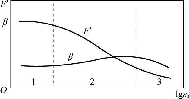 周期动态应变幅值对阻尼材料的阻尼特性有一定的影响,这是因为大的应变幅值常会导致阻尼材料大的能量损失,这就会引起阻尼材料很快地升温,所以,这时应是温度和应变幅值两者的综合影响。尤其在转变态区,阻尼值很高,这一现象更为突出。但是,在橡胶态区,由于模量和损耗因子随温度变化很慢,所以这时温度的影响相对于应变幅值变得次要了。因此,应变幅值对材料阻尼特性的影响多是在橡胶态区中研究。图2.6所示为在某一频率下,阻尼材料的实模量