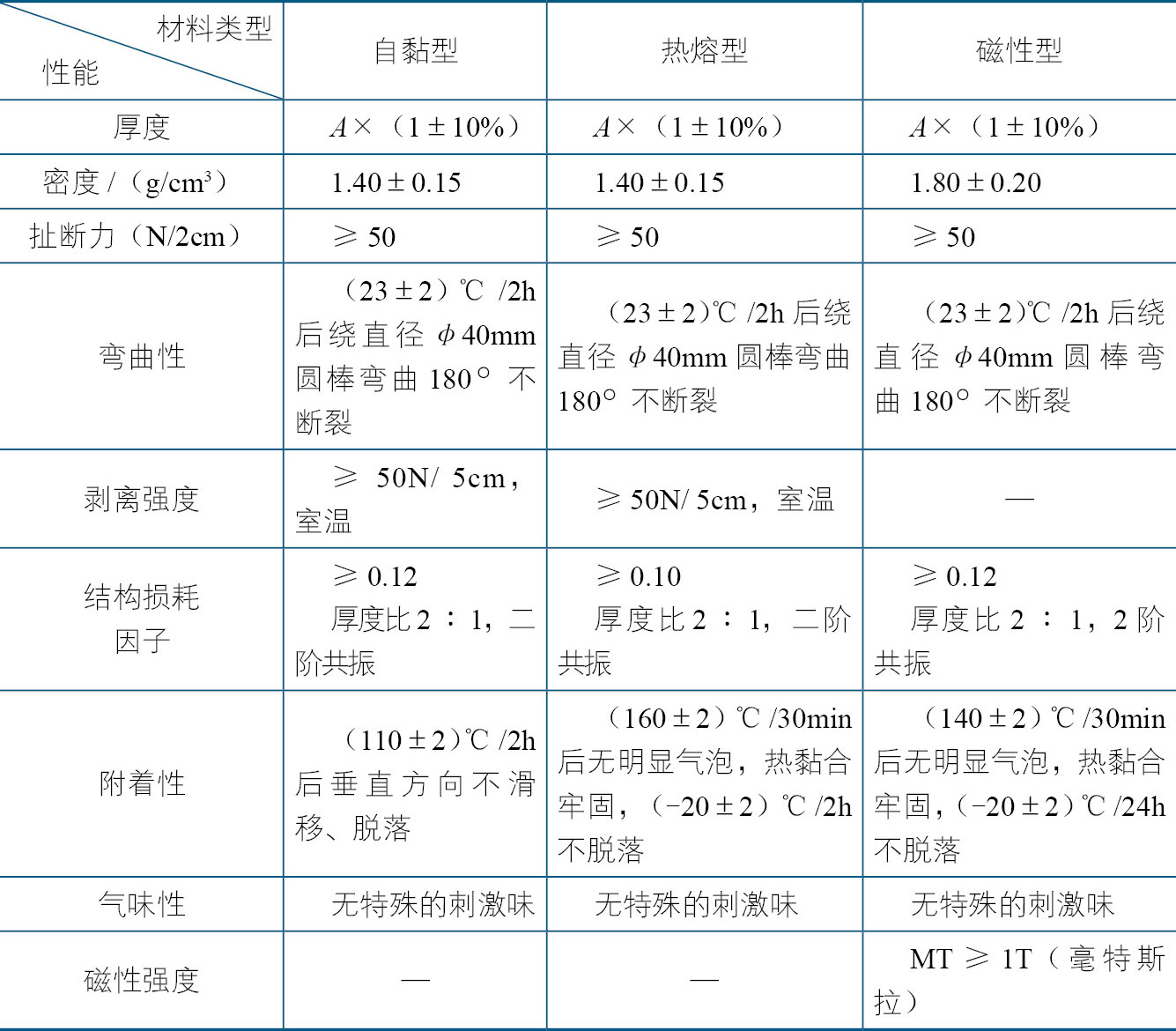 沥青阻尼材料在工程上的应用主要分为四大类,即自黏型、热熔型、复合型和磁性型。表2.4列举了某牌子汽车用沥青阻尼材料的一些典型性能要求。