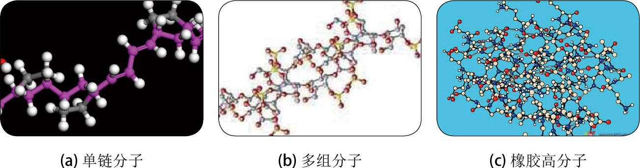 图2.3 单链分子、多组分子及橡胶高分子结构示意图