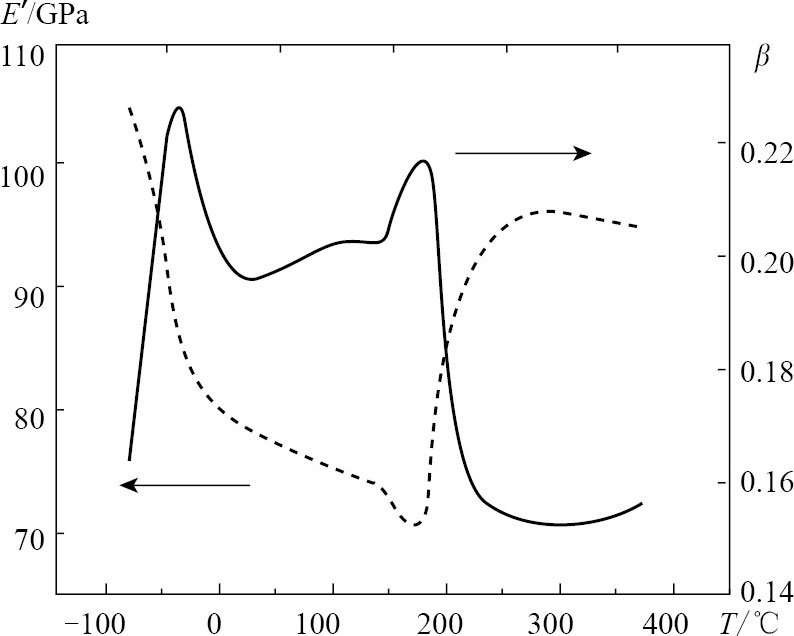 图2.16 Mn 85.4 Fe 9.6 Cu 5 合金的阻尼性能(实线)及杨氏模量(虚线)随温度的变化