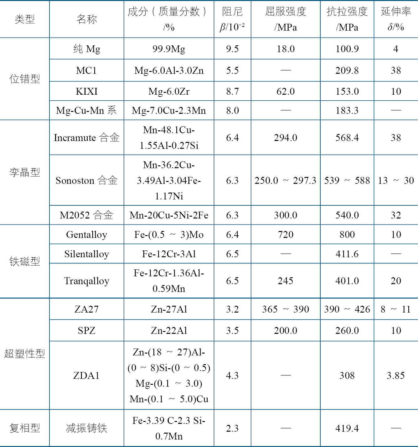 常见的孪晶型阻尼合金有Mn-Cu、Ni-Ti、Cu-Al-Mn和Cu-Zn-Al等。