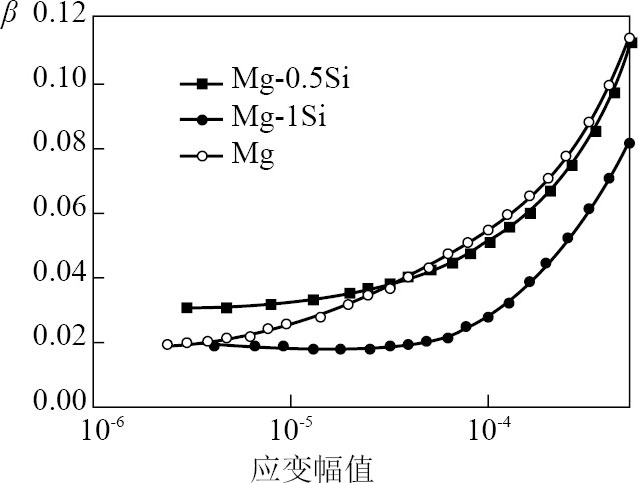 纯镁(Mg)在各种金属材料中具有最好的阻尼性能,且密度很小,耐蚀性好,但是,其力学性能严重不足,尤其是强度低,限制了其应用。在实际应用中,常常对Mg添加少量锆(Zr)、锰(Mn)或高强度的石墨纤维等材料,以提高Mg的综合性能,如Mg-Zr、Mg-Si、Mg-Cu、Mg-Al等。其中,Mg-xSi合金的阻尼性能如图2.15所示。