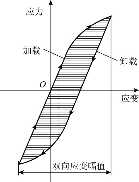 式中, k 为弹簧刚度,从式(1.10)可以得到稳态简谐振动中,相应的阻尼力的幅值与 ω 无关,而总内力在力-位移平面上构成的一个斜偏椭圆形滞后回线的面积也不再与 ω 有关,如图1.4所示。从材料力学的材料加载、卸载曲线可以看出,对一种材料加载到超过弹性极限,然后卸载,并继续往反方向加载,再卸载。一个循环过程中,应力应变曲线会形成一个滞后回线。滞后回线所包的阴影面积表示了材料在一个循环单位体积释放的能量。这部分能量将变成热能散失掉。
