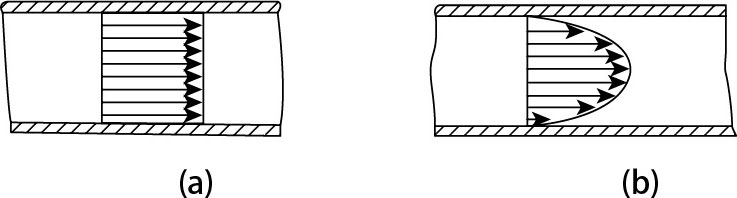 工程实际中,各种结构往往和流体介质接触,如桥梁结构与河水相接触、流体机械与油液相接触、薄壁结构与空气相接触等。大部分流体具有黏滞性,在运动过程中会耗损能量。如图1.3所示,流体在管道中流动,如果流体不具有黏滞性,那么流体在管道中按同等速度运动,如图1.3(a)所示;否则,管内各处流体的流动速度是不等的,大多数情况下,管道轴线截面流体速度呈抛物面形,如图1.3(b)所示。