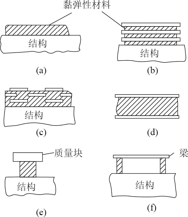 5)附加阻尼。在振动体上,使用各种方式附加一层具有高内阻的黏弹性材料(如沥青基制成的胶泥减振剂、高分子聚合物和油漆腻子等),振动时使阻尼材料产生很大变形,消耗振动的能量而不损坏振动件。如图1.22所示,图1.22(a)所示为附加自由阻尼层(也称为非约束阻尼层),是在振动体上直接喷涂一层黏弹性材料,方法简单、成本低,但阻尼性能较差;图1.22(b)所示为附加多层约束阻尼层,在黏弹性材料上附加一薄层或多层刚性材料,当振动体变形时,起约束作用的刚性材料不变形,从而增加黏弹性材料的剪切变形,提高阻尼性能;图1.22(c)所示为附加多层间隔约束阻尼层,把起约束作用的刚性材料薄片按一定间隔排列在黏弹性材料中,其阻尼效果将显著提高;图1.22(d)所示为附加阻尼夹心镶板,可安置于振动系统中,使阻尼材料产生较大的变形而发挥消耗能量的阻尼作用;图1.22(e)所示为附加共振阻尼装置,是由黏弹性材料和质量块组成的装置,相当于高阻尼的单自由度系统,附加在振动体上将产生谐振,使黏弹性材料产生更大的变形,发挥更好的阻尼作用;图1.22(f)所示为附加共振梁阻尼装置,与图1.22(e)所述的装置相比,工作原理相同,但有更多的黏弹性材料发挥阻尼作用,增加了阻尼效果。