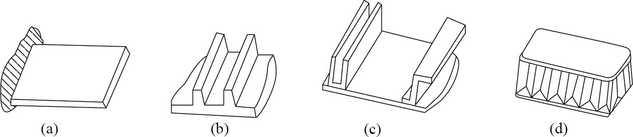 2)结构阻尼。结构的形状明显地影响着振动能量的消耗与扩散。在图1.21中给出了几种典型的阻尼性能好的结构外形:图1.21(a)所示为柔性的梁或板;图1.21(b)所示为外表加肋的结构,适用于飞机的机壳、汽车车身及金属建筑物的机架;图1.21(c)所示为若干金属板组合的刚性结构;图1.21(d)所示为蜂窝形板和壳。