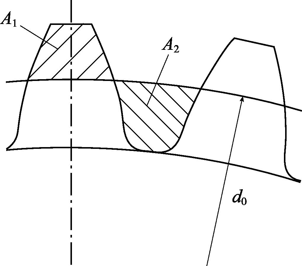 国内早期关于齿轮滚轧成形坯料初始直径的研究多集中于花键产品,而且多是处于生产一线的研究报道。青岛生建机械厂的郑全刚 [1] 、福建晋江市成达齿轮厂的傅耀先 [2] 、南京工艺装备厂的张光裕 [3] 、兰州理工大学的刘志奇 [4] 、太原科技大学的张大伟 [5] 和张兴旺 [6] 在对花键冷滚压精密成形研究中,均对滚压前坯料直径的选取进行了分析求解。因为冷滚压是塑性成形过程,坯料在挤压前后体积不变,且假设坯料轴向不发生变化,因此,可利用坯料变形前后截面积相等原则,根据几何计算,求得坯料初始直径,如图2-2所示,即面积 A 1 = A 2 。可以按照渐开线齿形面积公式求解坯料初始直径。