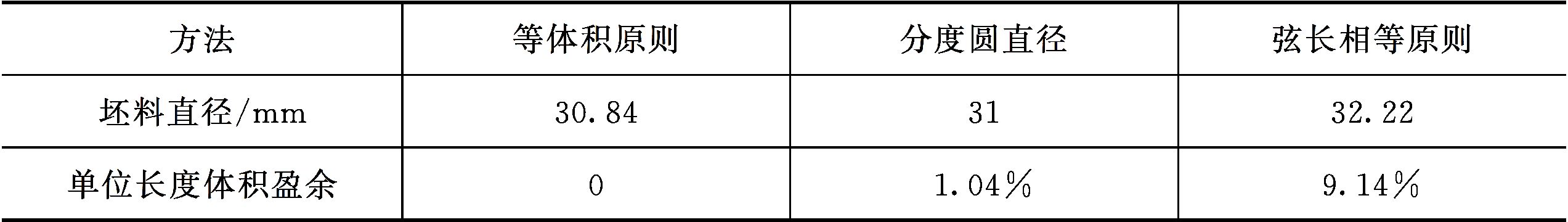 从表2-1根据实例给出的几种坯料直径确定方法的结果看,等体积原则确定的坯料尺寸当然是最为精准的,但成形过程不可能如此精准;按照分度圆直径选取坯料,其尺寸略高于等体积法确定的坯料直径,但如果分齿不均或者出现突耳,其1.04%的材料体积盈余无法满足所有齿形尺寸设计要求;按照弦长相等原则确定的坯料尺寸单位体积盈余为9.14%,满足齿形突耳缺陷或齿廓精度偏差等后续切削加工或磨削加工需求。