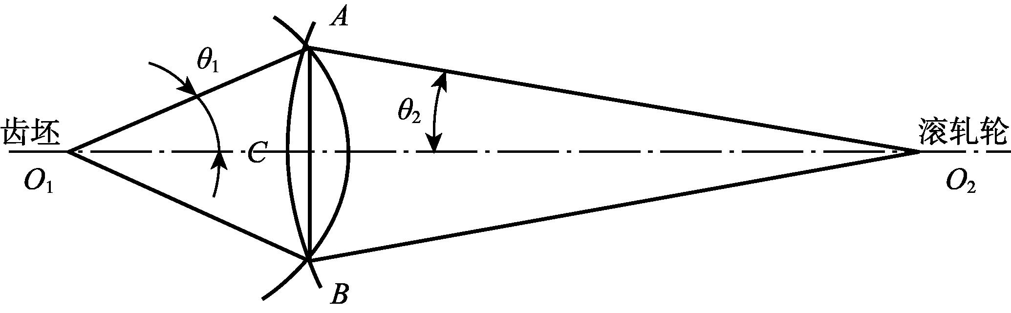 按上述方法求得的坯料直径是保证滚轧成形后获得所需齿轮形状的最小坯料直径,因其均未考虑齿坯成形过程中出现的突耳缺陷。因此坯料初始直径应考虑预留切削余量,初始直径应该稍微放大一些。而且根据分齿均匀性的需要,为保证坯料正确分齿,防止无打滑状态下不发生错齿、乱齿、多齿等缺陷,坯料直径尺寸还应和滚压轮齿顶圆直径尺寸按照接触弧齿的弦长相等原则进行调整,如图2-3所示。