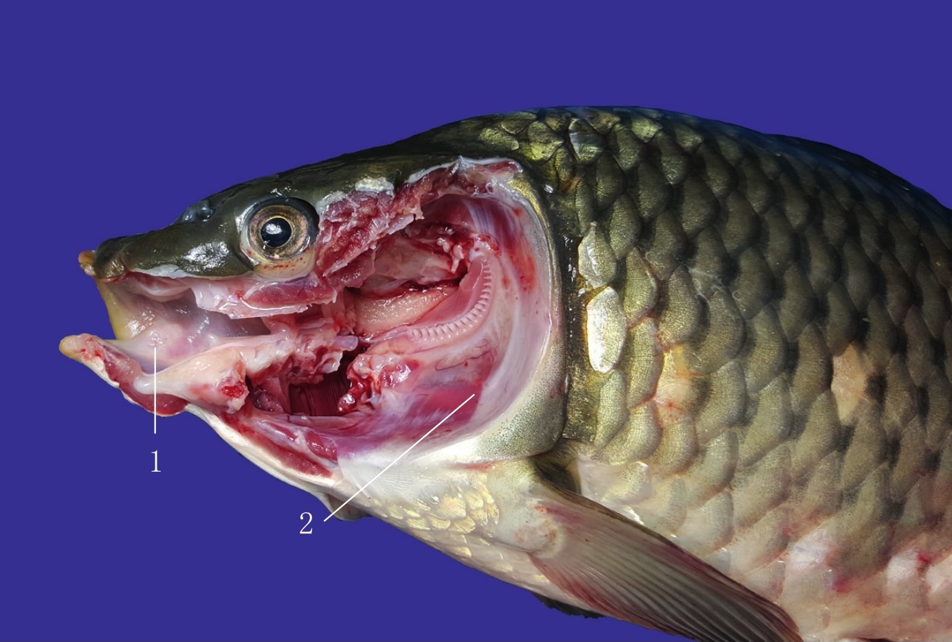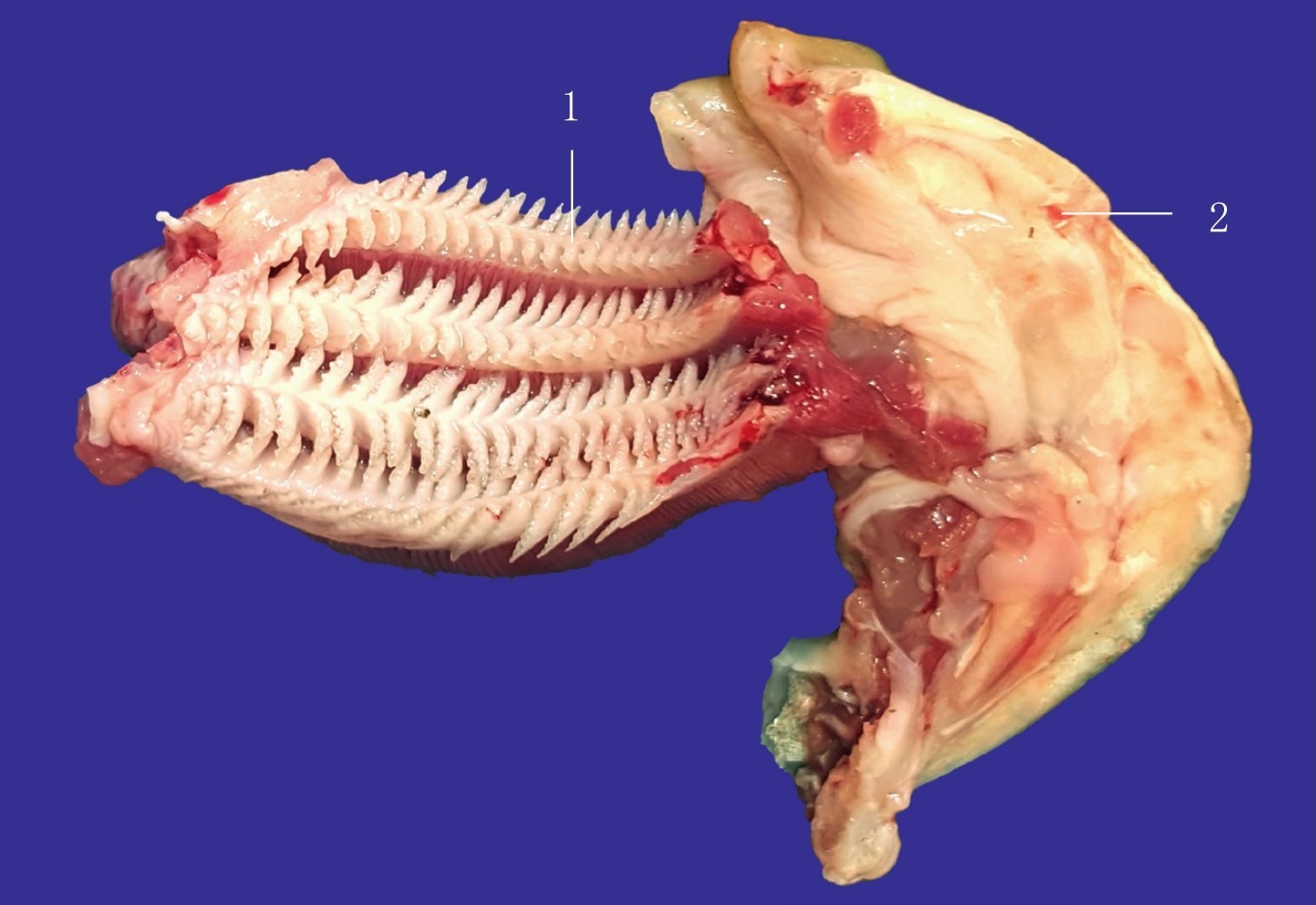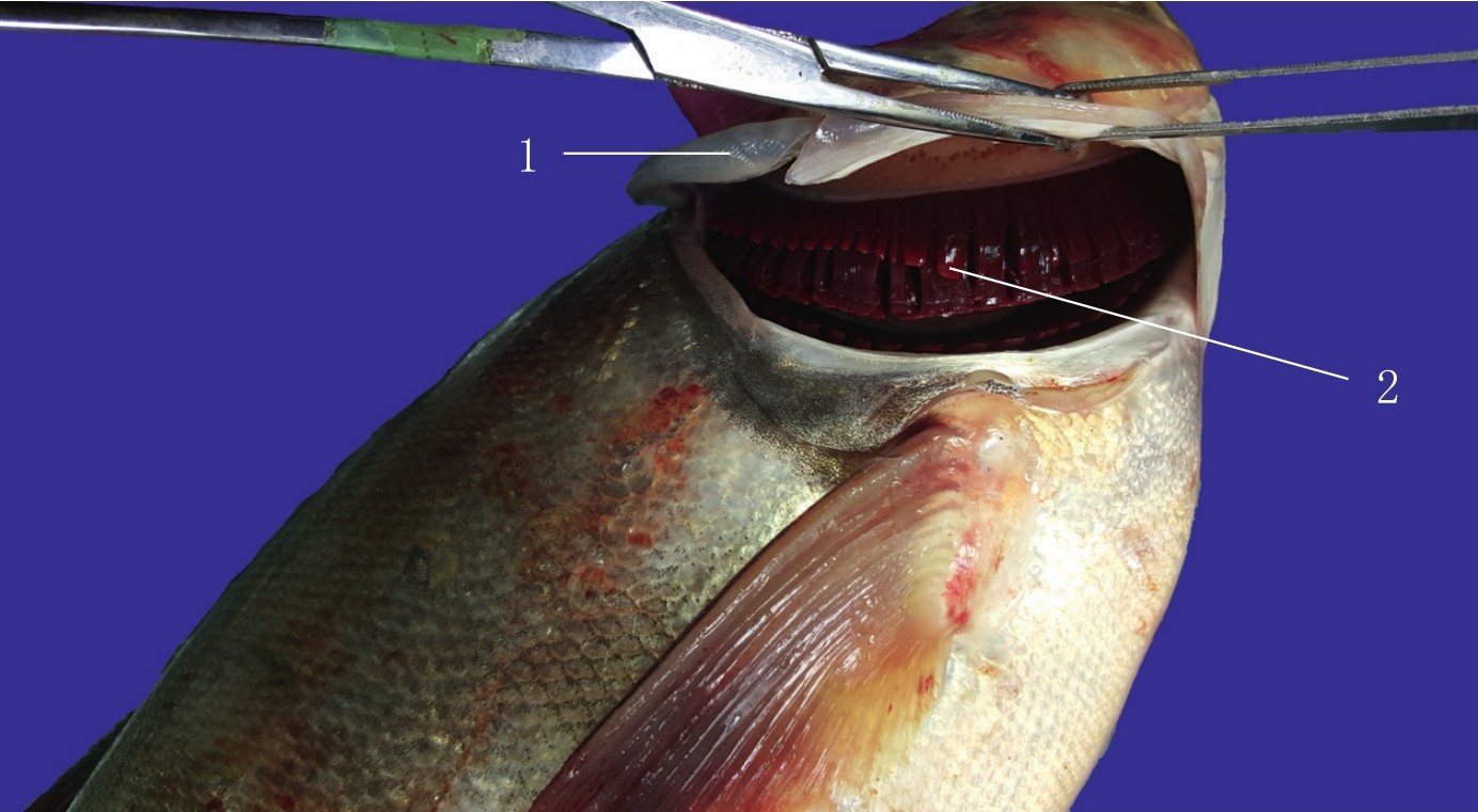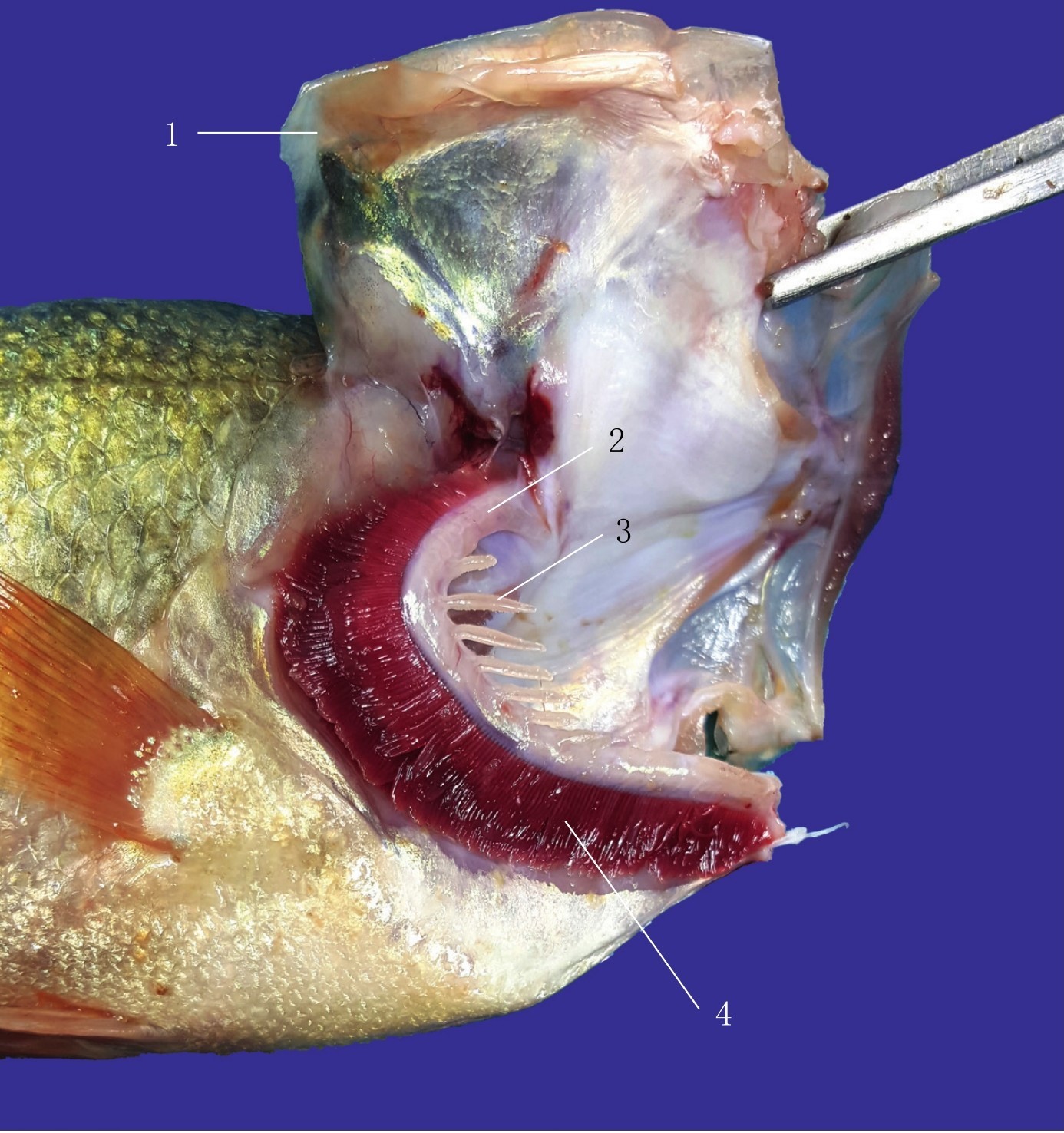 1—鳃盖;2—鳃弓;3—鳃耙;4—鳃丝