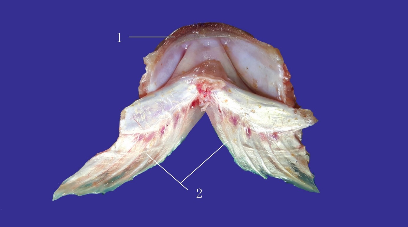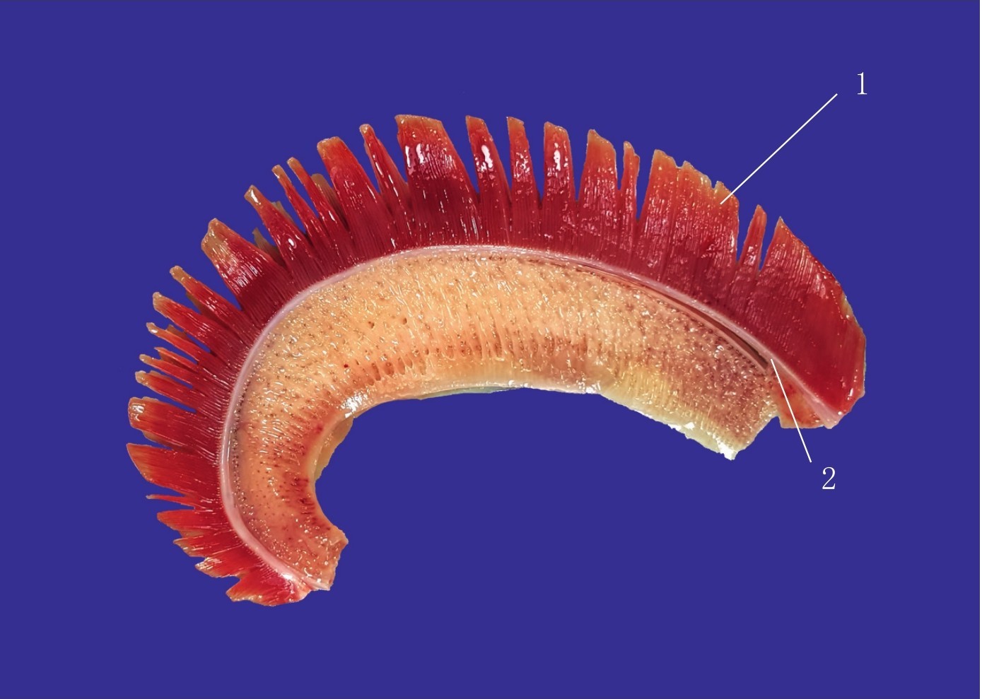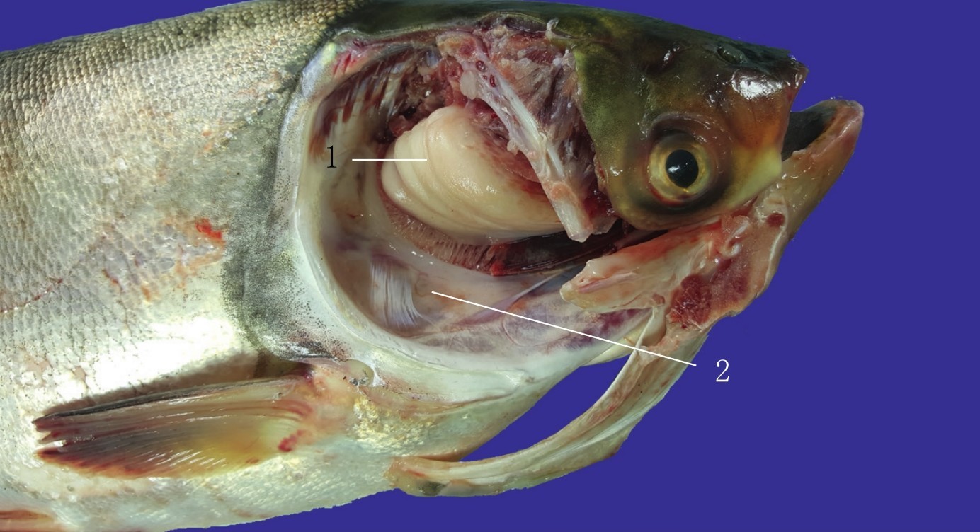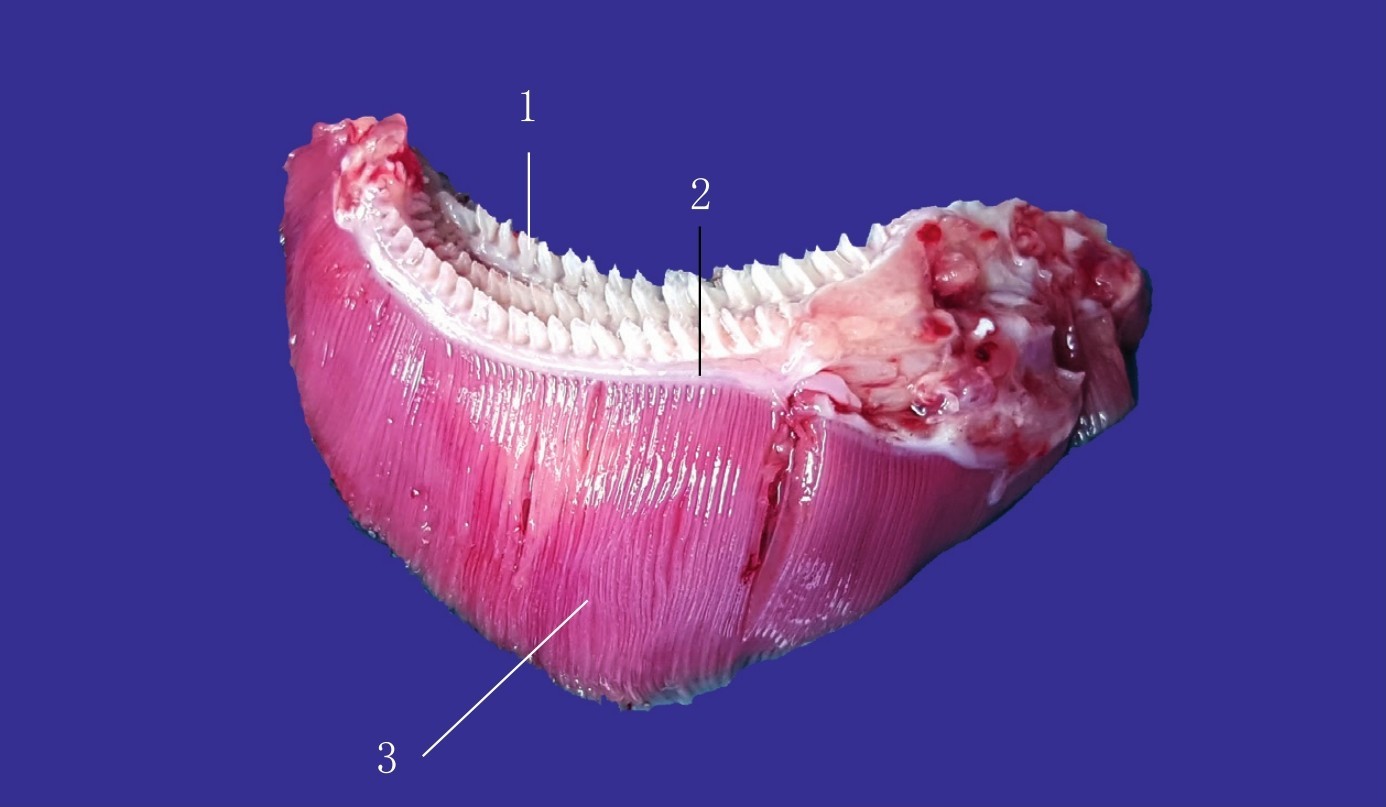 1—鳃盖;2—鳃弓;3—鳃耙;4—鳃丝