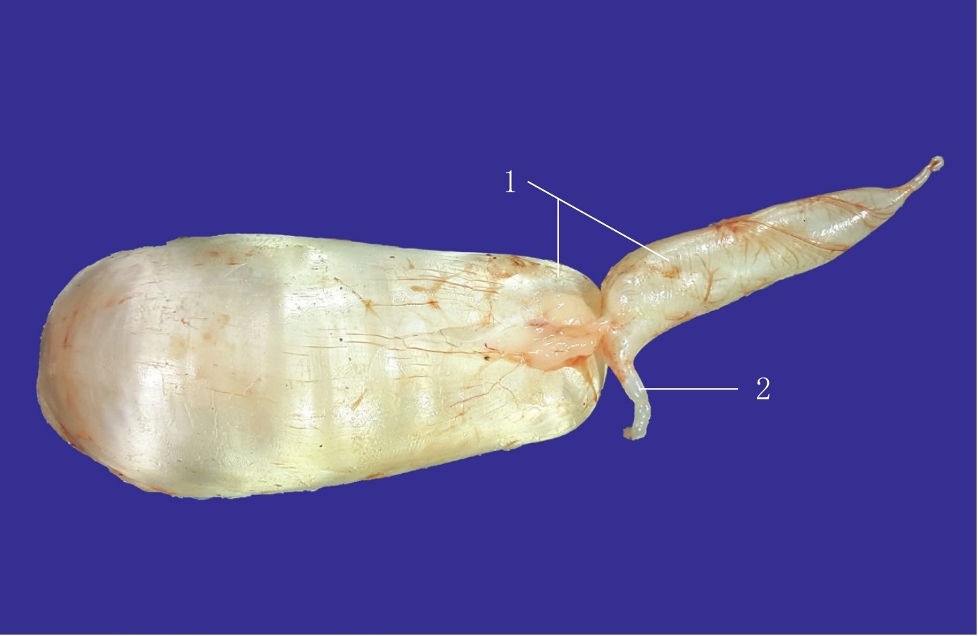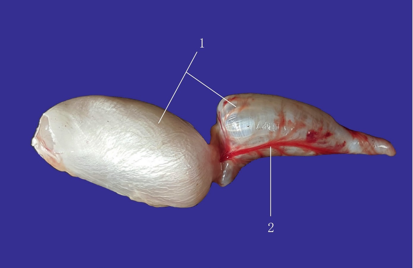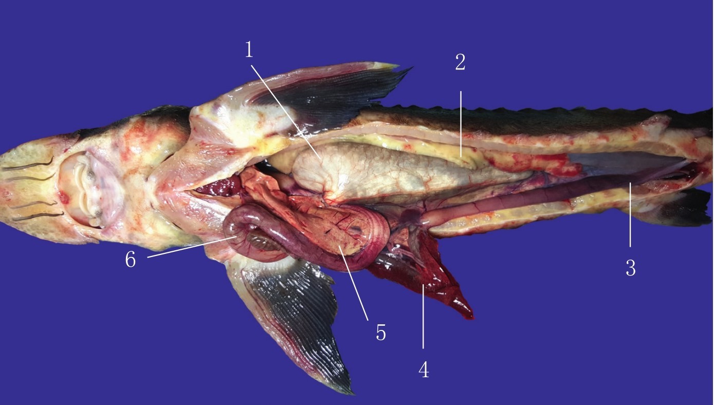 1—膘;2—精巢;3—直肠;4—脾;5—肝胰腺;6—肠