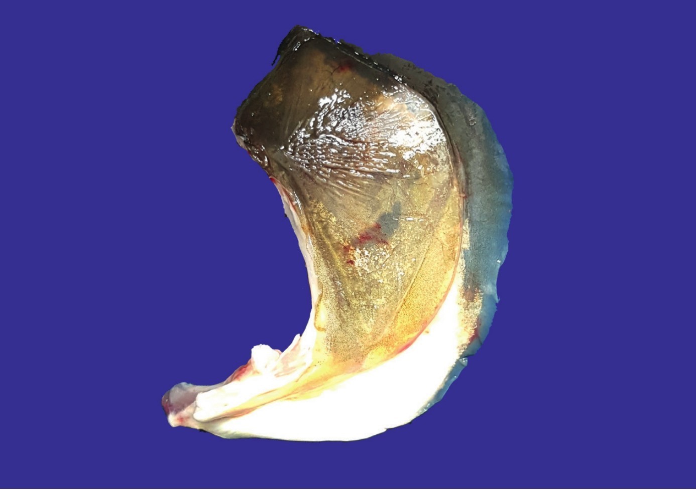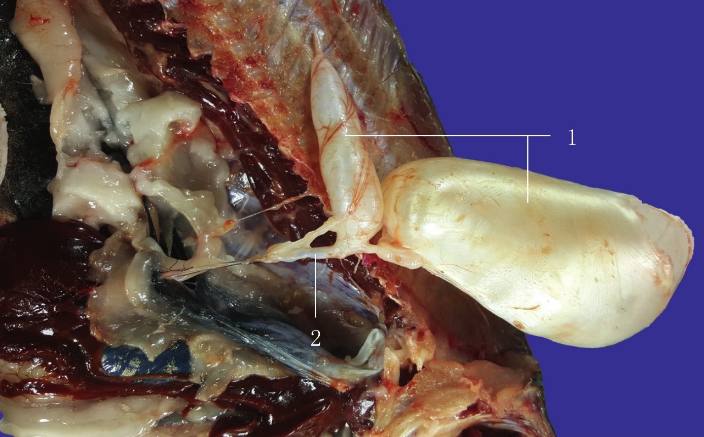 鳔为鱼体内可涨缩、内部装有空气的白色气囊。有一大一小两个,大的呈不规则圆柱状,小的呈不规则锥形。发挥调节密度、呼吸、感觉及辅助发音等作用。通过呼气或吸气来调节鱼体密度,协助鱼停留在水的深度;能够感受压力、声音;通过共鸣作用,扩大声音。