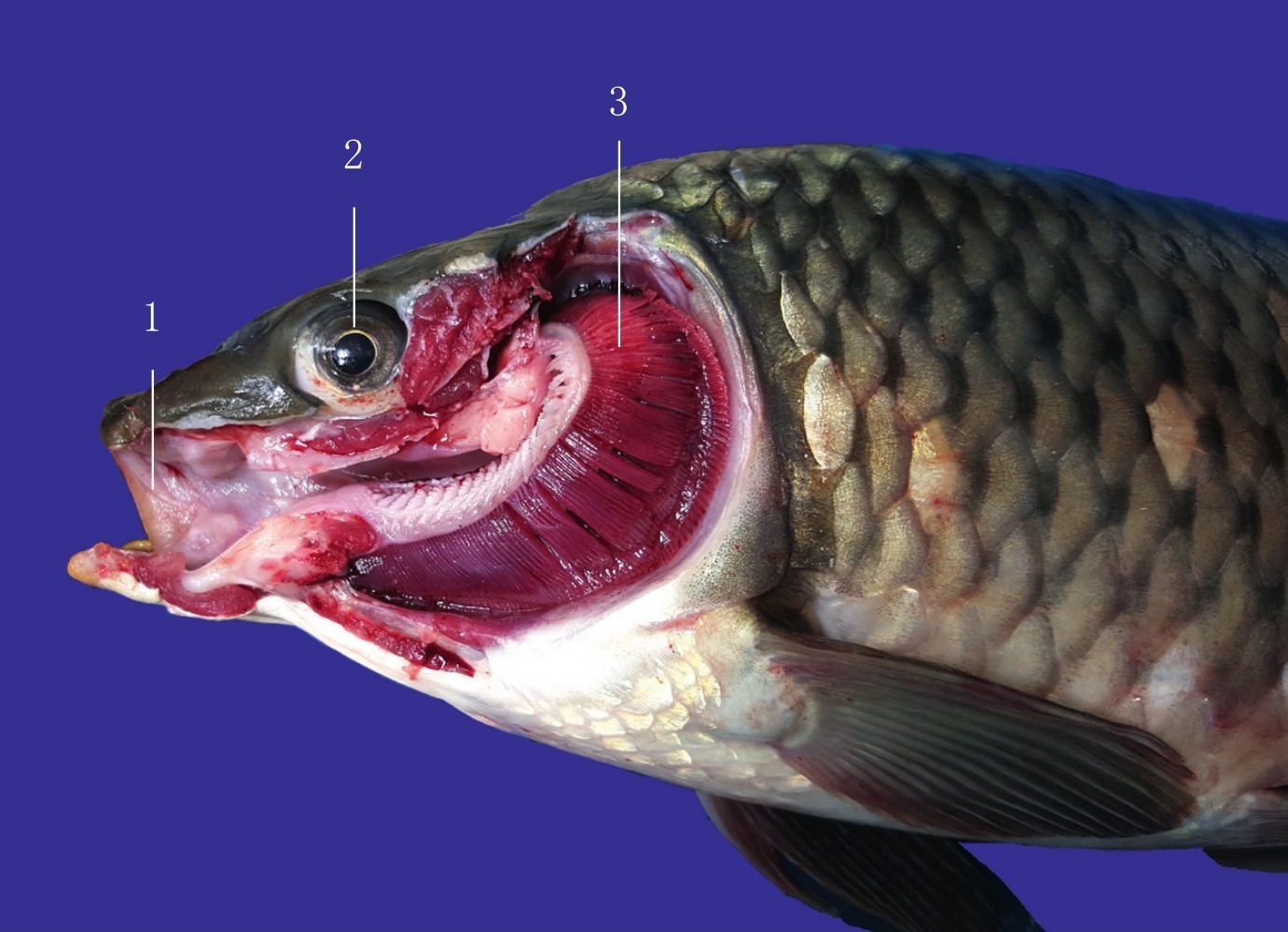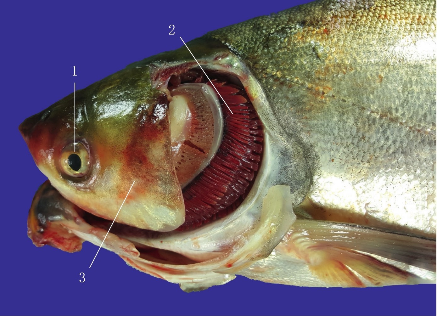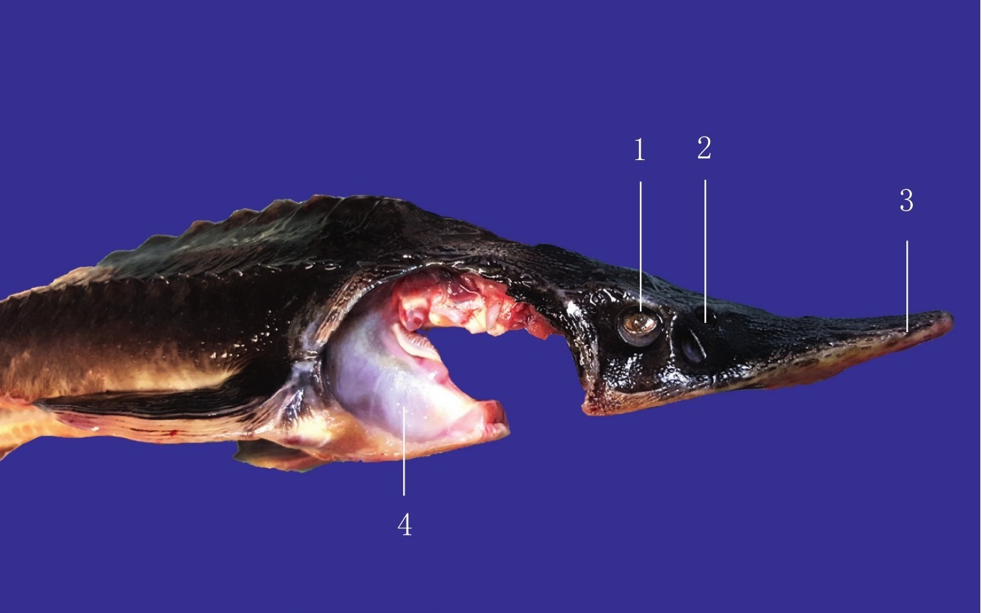 1—眼;2—鼻孔;3—上颌;4—鳃腔