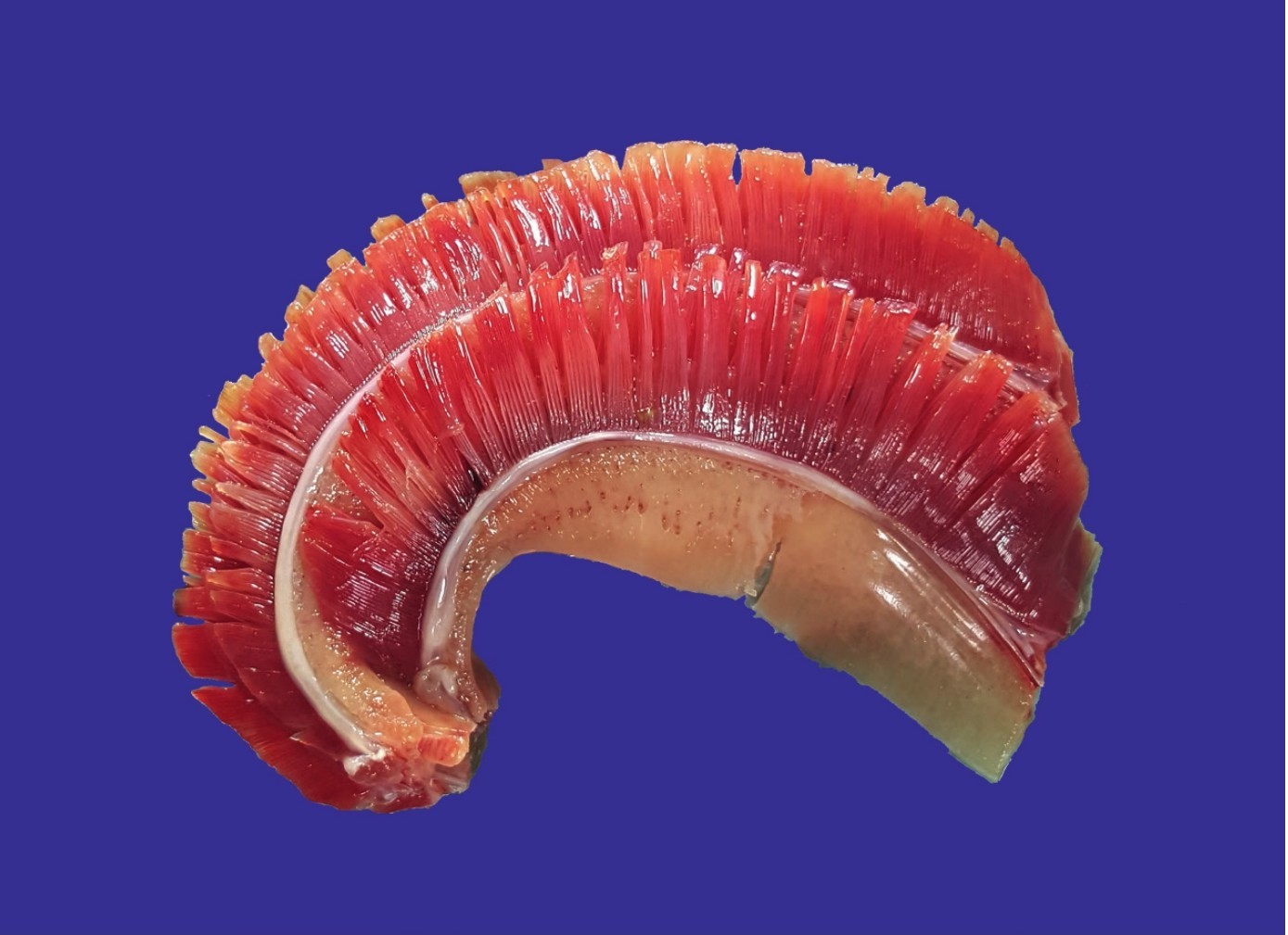 头部两侧鳃盖下的鳃腔内各有八排红色、半圆形瓣状的鳃片,鳃片由许多平行排列的鳃丝组成,每根鳃丝两侧发出许多细小的鳃小片。鳃片、鳃丝和鳃小片完全张开可扩大鳃与水的接触面积,增加摄取水中氧的效率。鳃分为鳃盖、鳃弓、鳃耙、鳃片和鳃间隔。