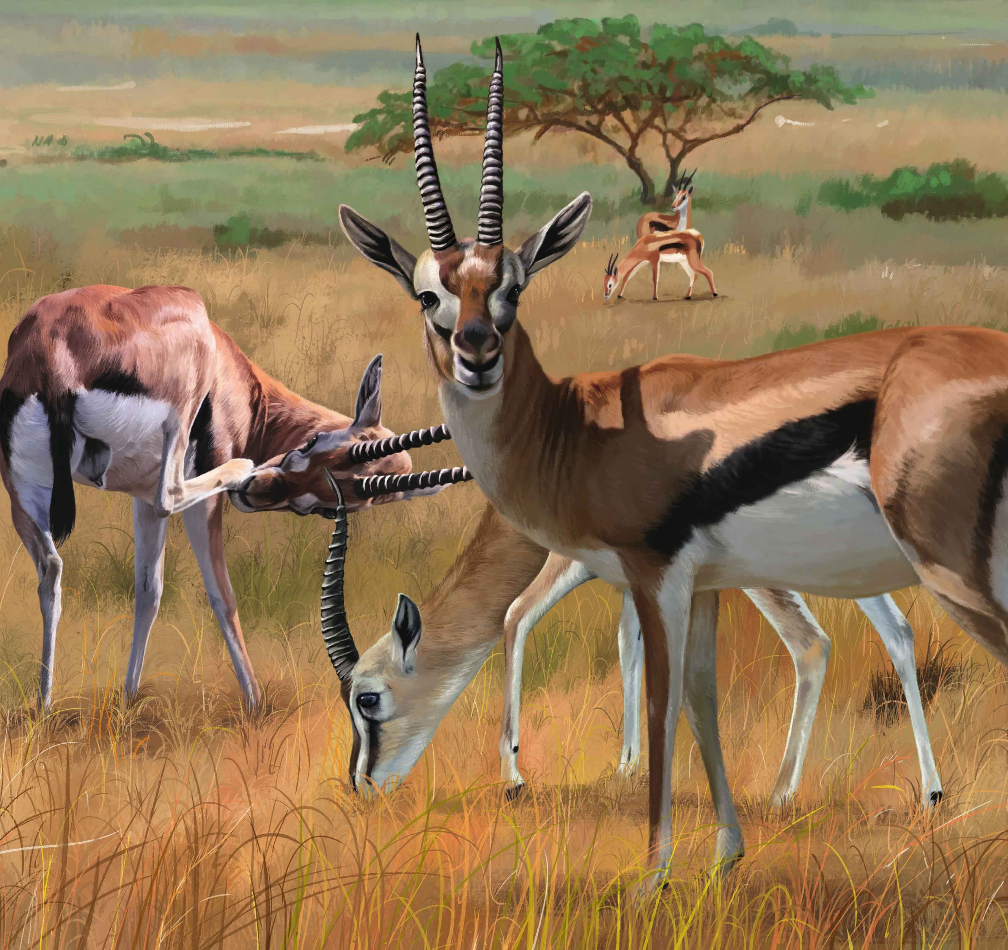 瞪羚生活在辽阔的非洲热带草原上,它们身上披着黄色的皮毛,在身体两侧分别还有一条黑色的条纹。瞪羚的眼睛向外鼓着,瞪得很大很大,它们也因此得名。这种羚羊是非洲草原上的捕食者们最喜欢的猎物。瞪羚喜欢结成小群生活。对于食草动物来讲,群居是最好的方式,因为这样才能有更多的活命机会。一只瞪羚一边吃草一边警惕地观察着周围,看远处是否有猎食者偷偷靠近。它是这个群体中的哨兵。一只猎豹正偷偷地向瞪羚群靠近,哨兵意识到这个家伙会给它的群体带来灾难,于是,它使用肢体动作边跑边腾跃,同时发出叫声来通知其他成员。