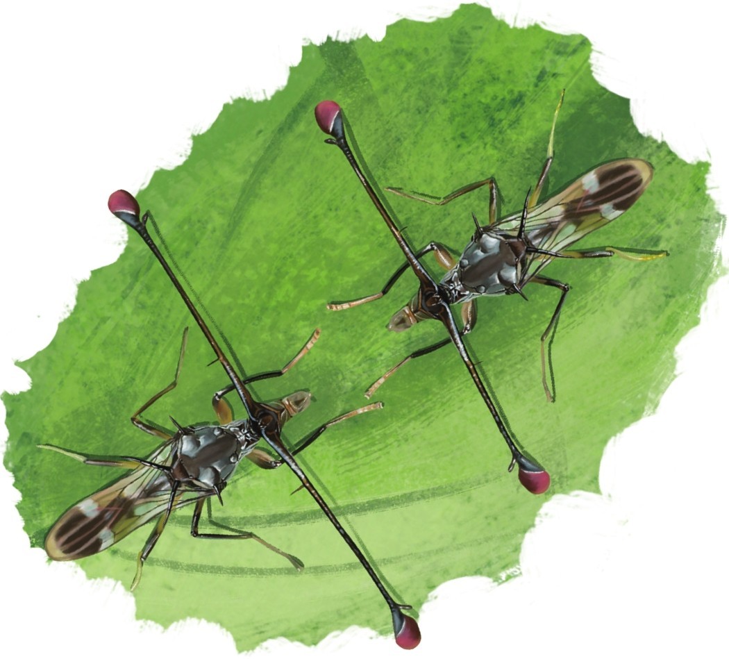 雄性突眼蝇之间在争夺配偶的竞争中会显得文明许多。两只雄性突眼蝇相遇了,它们两头相对,通过比量两眼间距来决定交配权。答案是肯定的,眼间距长的一方获胜。