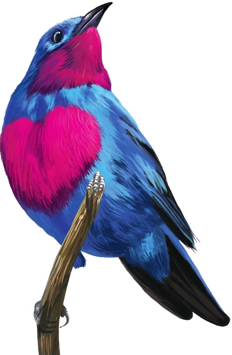 中美洲的雄性秀丽伞鸟,黑色羽翼上是鲜艳的孔雀蓝,胸脯呈耀眼的紫红色,在阳光的照耀下炫丽夺目。求偶的过程中,参与竞争的雄性会展示自己的羽毛,越光亮鲜艳就越容易得到雌性青睐。