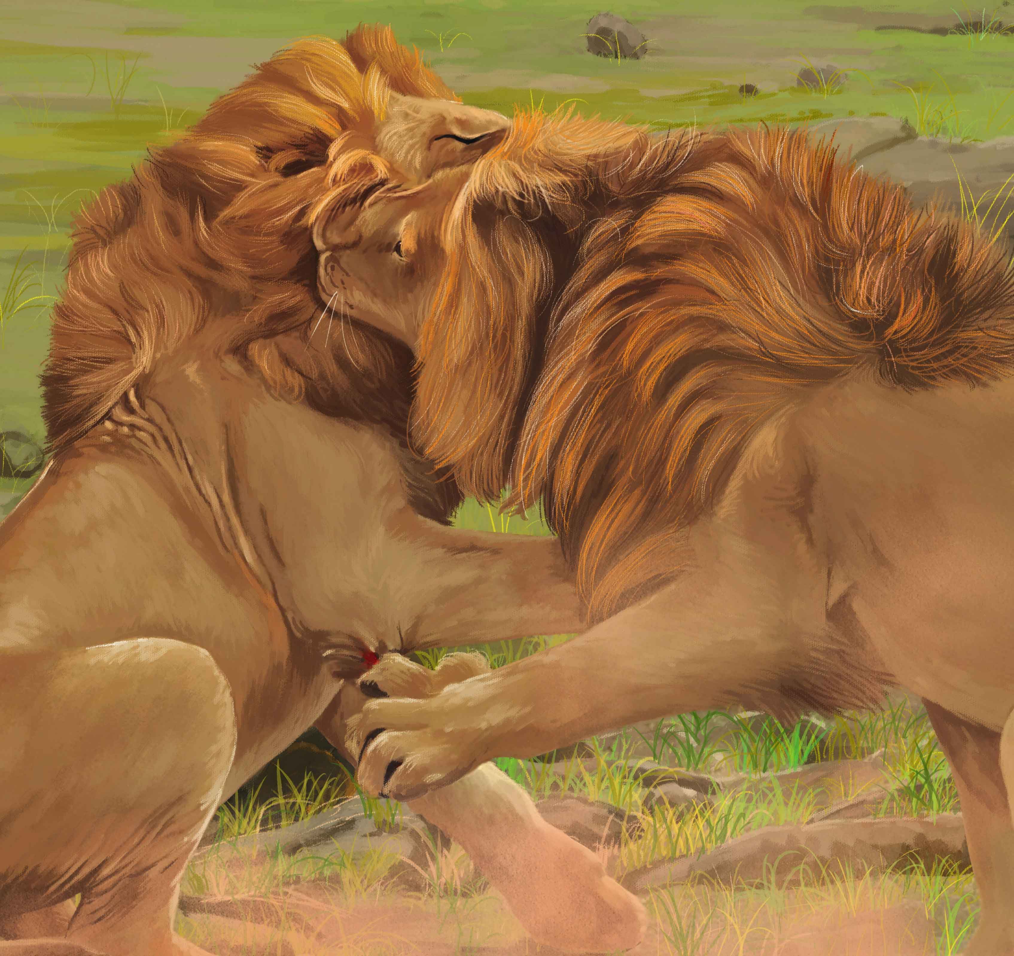 雄性动物之间会经常发生争执,有时是因为争夺领地,有时是因为争夺领导地位,有时则是为了争得更多的交配机会,大部分矛盾都是通过斗殴来解决的。一个狮群一般由一只雄狮、十几只雌狮及小狮子组成,而雄狮是唯一的领袖。雄狮通过撕咬打斗击败对手而登上狮群的领导地位,但守住这个位置很困难,很多刚成年的雄狮和流浪汉会向首领发起挑战。面对挑战,首领必须拼尽全力保住自己的位置。它先向对手发出威吓式的警告,在警告无效后,两只雄狮的争斗便在滚滚烟尘中展开。这场争斗无外乎有两种结果,要么年轻的雄狮敌不过老首领而败走,要么老首领被杀死或被赶跑。如果老首领失败了,那么不仅它要开始流浪,还会丢掉所有后宫佳丽以及搭上后代的性命。