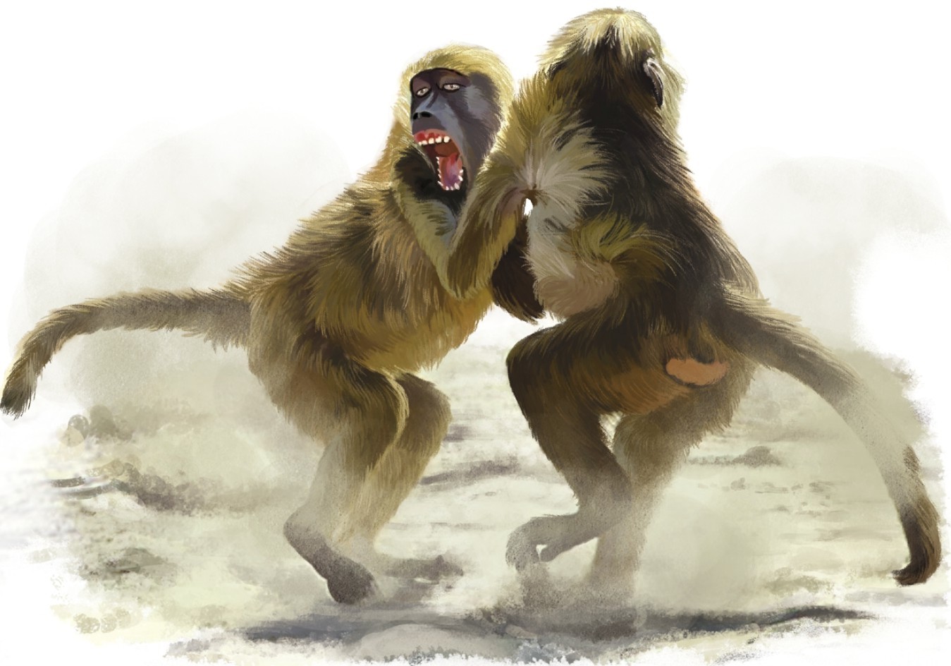 雄狒狒打架是很有趣的,和人类很像。雄狒狒之间有地位高低之分,处于低等级的雄性经常会向上级发起挑衅。它们先是嚎叫争吵,接下来拍打地面向对方示威,如果挑战者不放弃,那么一场混战就开始了。等级低的狒狒会因胜利而提高自己在群内的位置。
