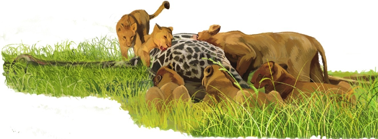 凶猛的雌狮将猎物扑倒咬伤后,会立即用吼叫声鼓励小狮子们前来撕咬,并会向小狮子们示范如何撕开猎物的肚皮,取食它们的内脏器官。食物是生存的关键,如果小狮子们过不了这一关,它们将无法在以后的日子中安然地生存下去。