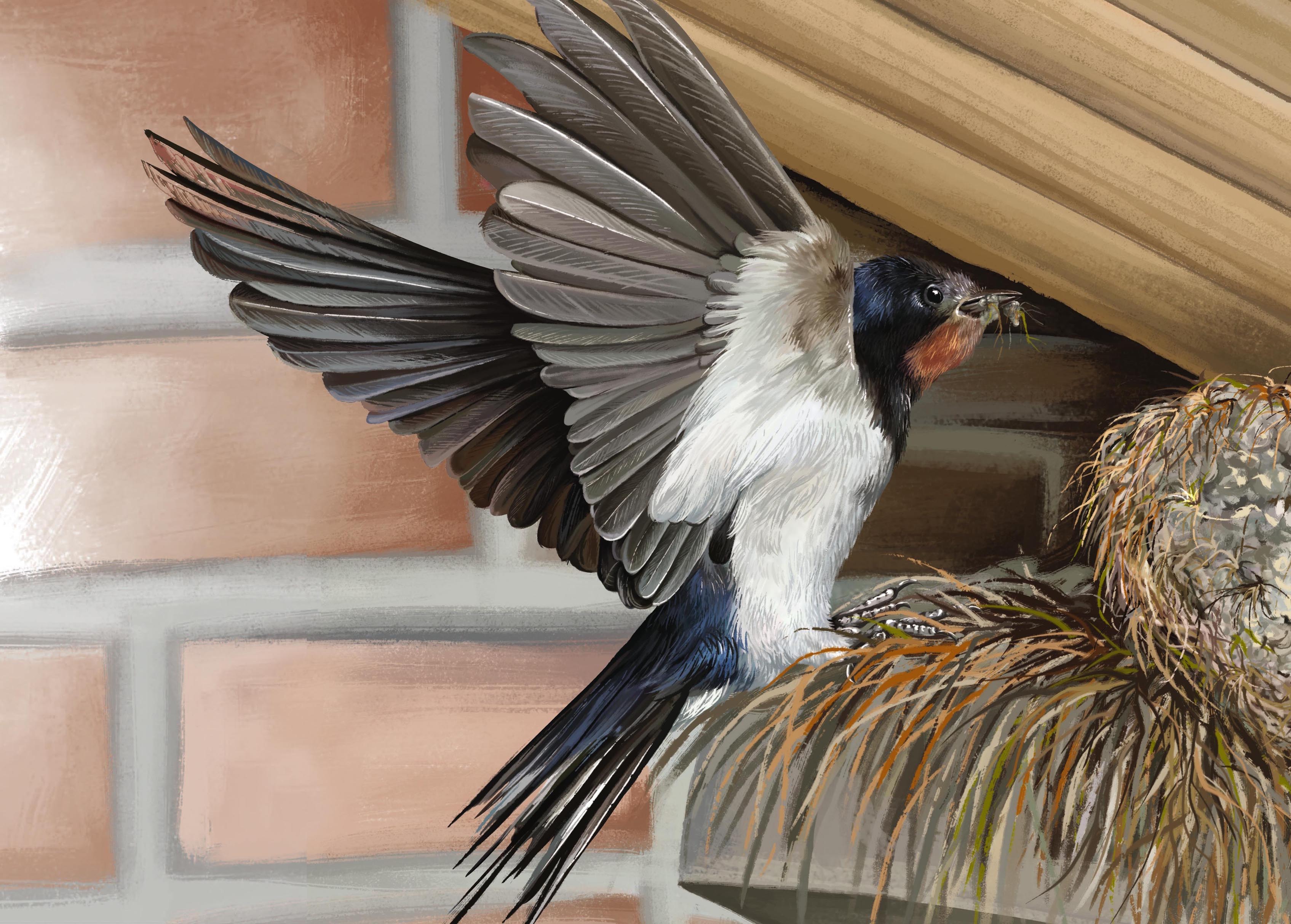每年春天,在南方越冬的家燕纷纷赶回北方繁殖后代。它们回到繁殖地后的第一件事情就是建设新巢或修葺旧巢。家燕选择在隐蔽的房檐下筑巢,因为这里能够遮风避雨,最主要的是能够躲避猎食者。它们从河流、池塘以及水坑边衔回泥巴,融合唾液,一点点垒起来,中间夹杂上草茎,如同钢筋一样起到加固的作用。大概经过一个多星期的忙碌修建,碗状或葫芦状的巢穴就建好了。接下来,家燕会将收集来的马鬃、羽毛和麻丝等柔软的东西铺垫在巢里面。家燕会在这个巢中繁殖1~2窝幼仔。