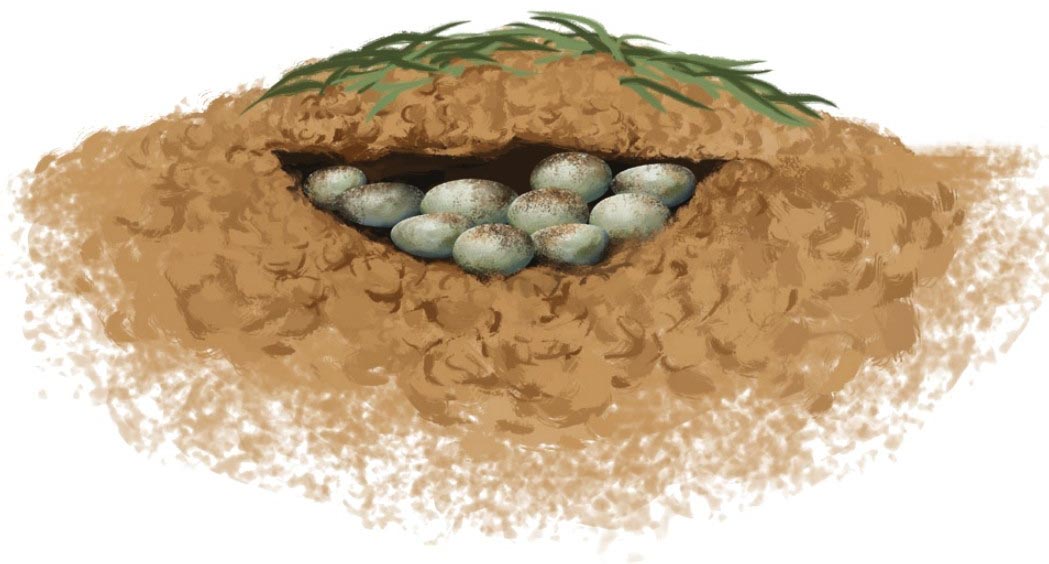 快要产蛋的时候,雌鳄鱼会爬上河岸寻找舒适的河床建造巢穴。鳄鱼建造巢穴的目的只是为了保护蛋不被伤害,因为成年鳄鱼整天待在河中,根本不需要巢穴栖身。雌鳄鱼在河床上挖一个大坑,然后把蛋产在里面,接下来再用枯枝叶和土把蛋掩埋起来。鳄鱼蛋将在像坟丘一样的巢穴中孵化。