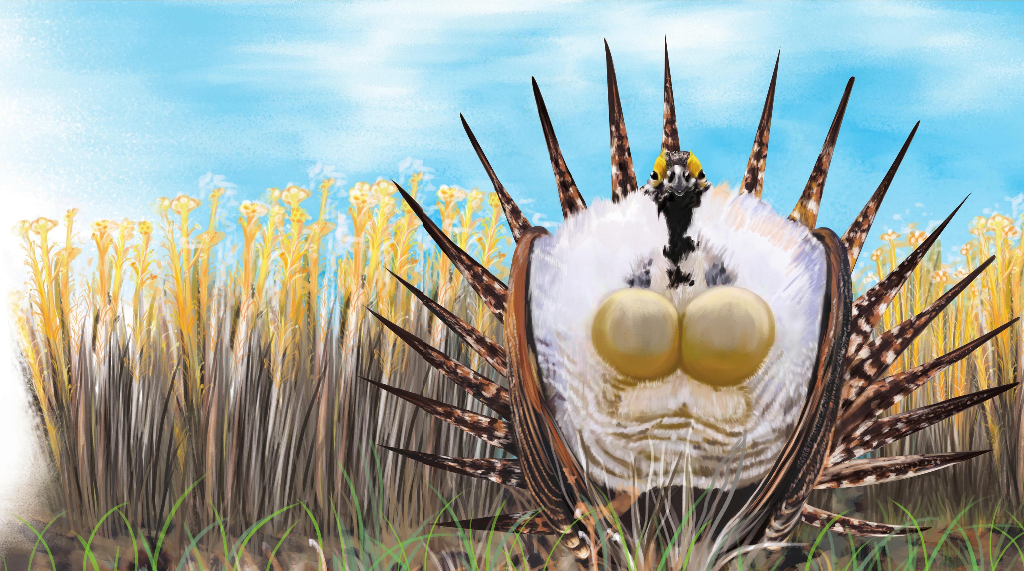 这只雄性艾草松鸡生活在北美洲西部的宽阔草地上,它已经向雌性发出了求爱信号。为了尽快获得雌性的芳心,雄性艾草松鸡一反常态,它竖起尖而长的尾羽,鼓起胸部的黄色气囊,在雌性面前昂首阔步,不知疲倦。