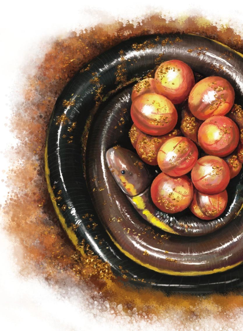 版纳鱼螈是一种极为特殊的两栖动物。版纳鱼螈妈妈也是两栖动物中少有的爱心妈妈,产完卵后,版纳鱼螈妈妈用身体小心翼翼地将卵围住,静静地等待它们孵化。