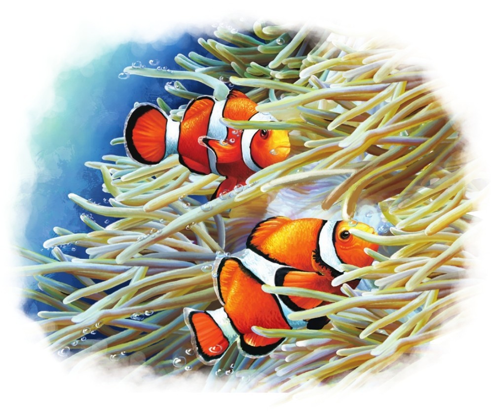 小丑鱼是一种体色艳丽的小型鱼类,经常出没于海葵丛中。小丑鱼把卵产在海葵丛中。在卵孵化之前,小丑鱼一直守护在卵的周围,并不断地扇动胸鳍,以增加水流中的含氧量,有助于卵的孵化。