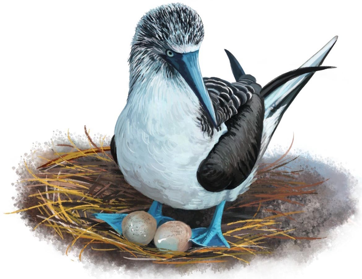 蓝脚鲣鸟的孵化任务由雌雄鸟共同负担。当雌蓝脚鲣鸟出去觅食的时候,雄蓝脚鲣鸟就静静地在巢中孵蛋,等雌鸟觅食回来后,它就将蛋交给伴侣,自己则飞到海上觅食了。