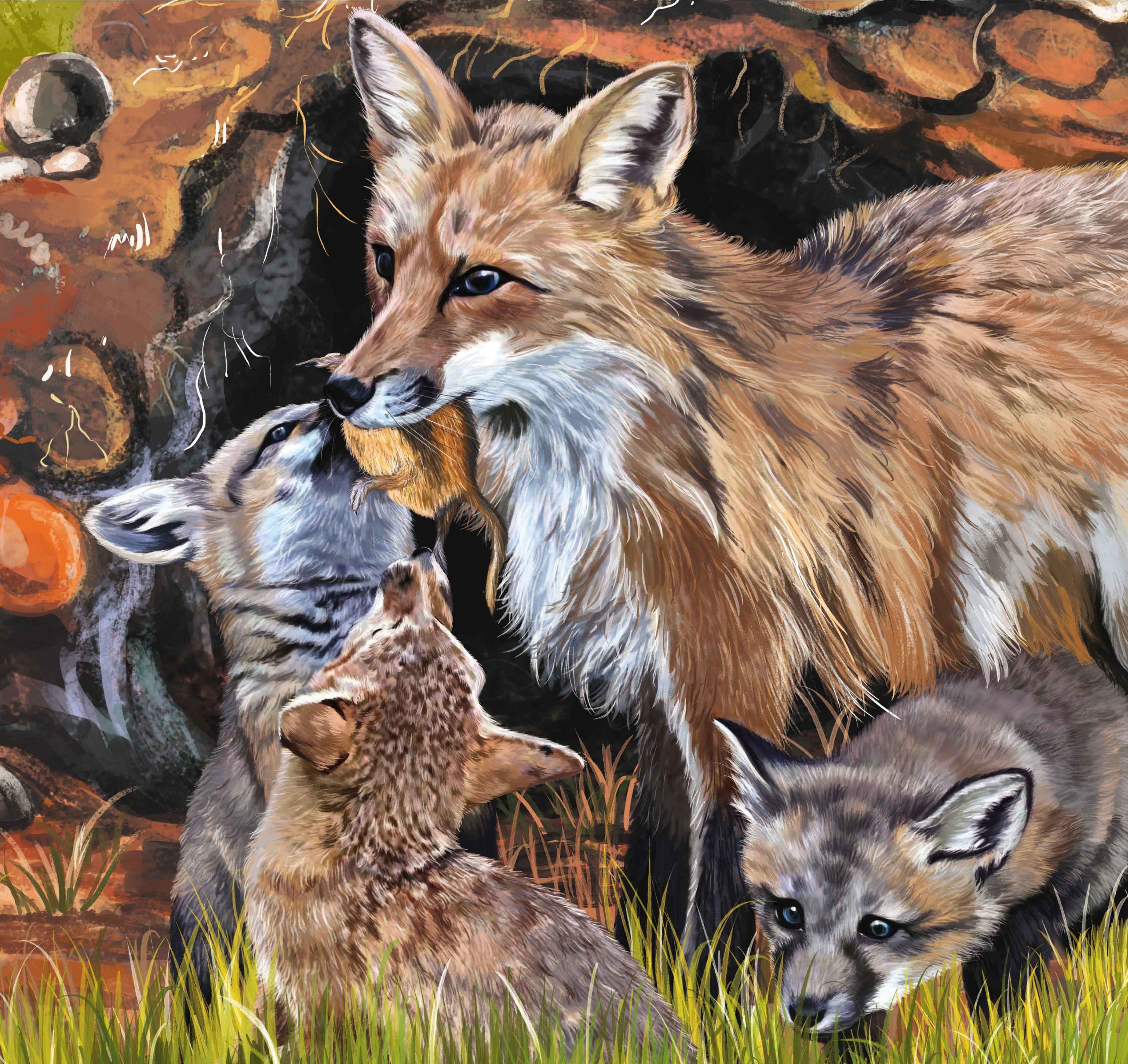 狐狸在树洞或土穴中安家落户,然后交配、产仔。小狐狸刚出生时就像毛毛球一样,眼睛还没有睁开,蜷缩在一起。出于本能,它们很快找到了妈妈的乳头,然后美滋滋地吮吸着。在接下来的几个星期中,狐狸妈妈除了觅食外,几乎很少离开洞穴,因为小狐狸需要被保护。很快,小狐狸的身体变得强壮起来,能够行走和奔跑了。现在,它们的正餐已经不是妈妈的乳汁了,而是各种动物的肉。每当听到妈妈的呼唤声,小狐狸们便知道又有美餐可享用了,于是冲出洞穴,抢食妈妈带回来的食物。