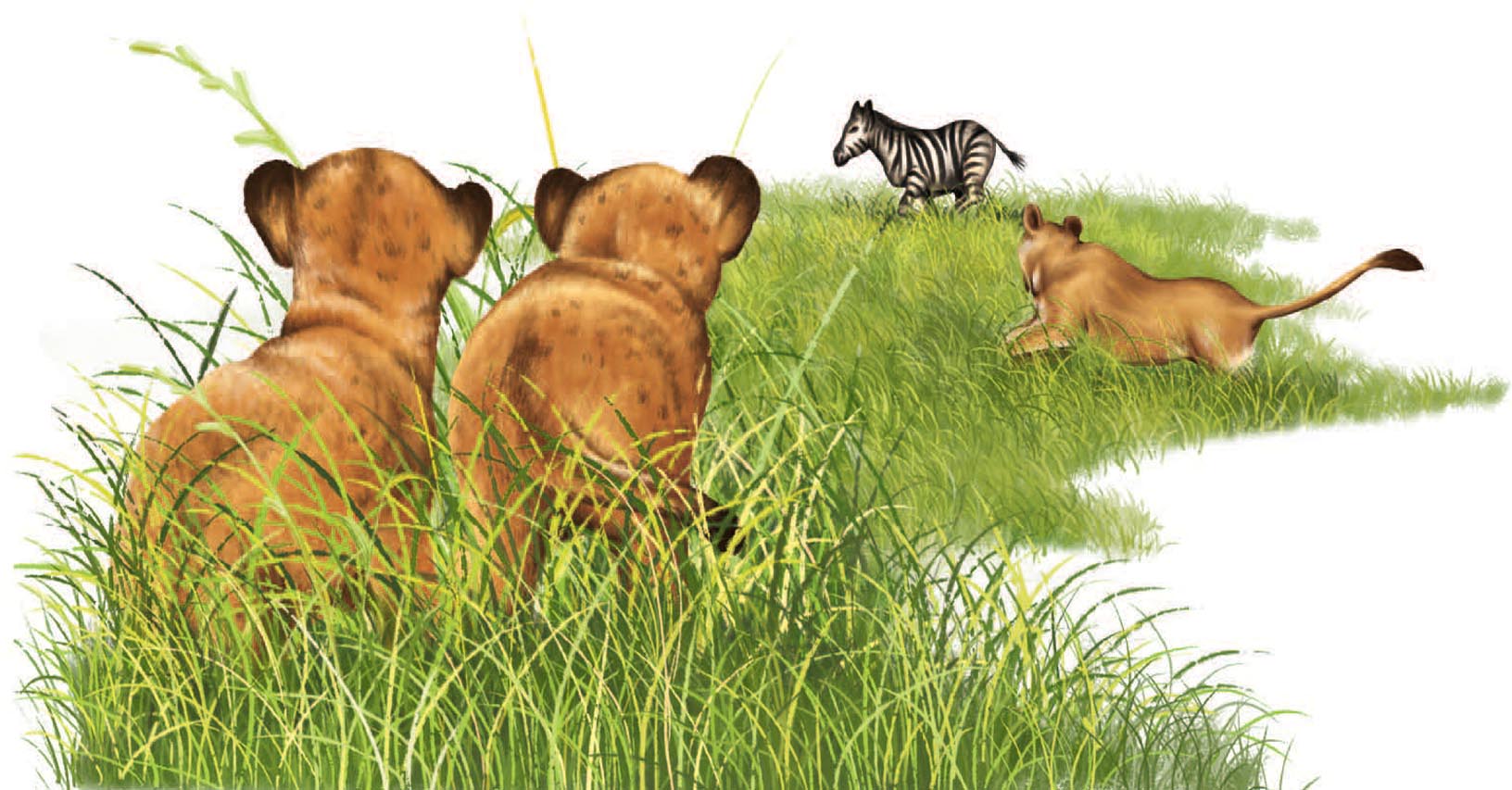 每当雌狮们围捕猎物的时候,非洲狮幼仔们就会藏在草丛中观察捕猎的整个过程。它们学会了如何匍匐着靠近猎物,学会了怎样突然发动袭击,以及怎样能够最快将猎物杀死,最主要的是学会了参与捕猎的成员间如何配合。