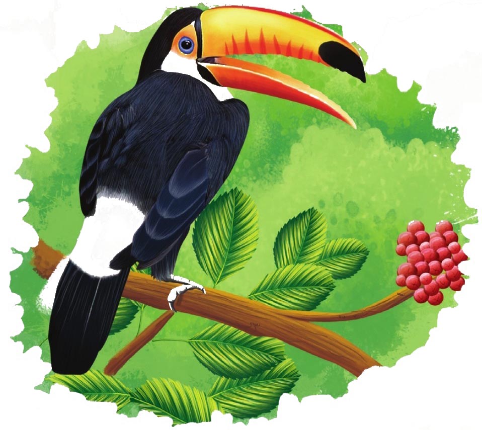 巨嘴鸟是一种生活在美洲热带雨林中的鸟类,它们长着色彩艳丽的大嘴。长大的巨嘴鸟必须学会怎样使用巨大的嘴巴取食果实,而雄性巨嘴鸟还要学会炫耀自己的大嘴巴,以此来吸引雌性。