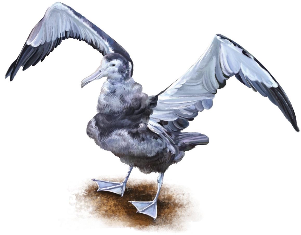 这只小漂泊信天翁已经蜕掉绒毛,慢慢长出适于飞行的羽毛了。它在巢中直立起身体,挥动着修长的翅膀练习飞行技术。漂泊信天翁天生就是飞行的专家,它们只需稍加练习就能成功地飞上高空。