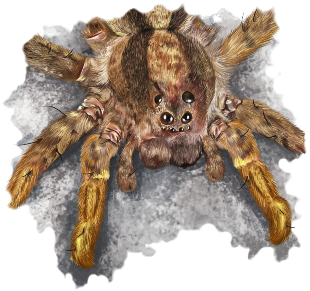 狼蛛长着八只眼睛,排成三列,它们各有分工:中间的两只大眼睛主要用来锁定目标;后列的两只眼睛主要用来观察体侧和身体后方的情况;上列一排四只小眼主要观察物体的移动。这八只眼睛弥补了狼蛛的头不能上下左右及向后自由转动的不足。
