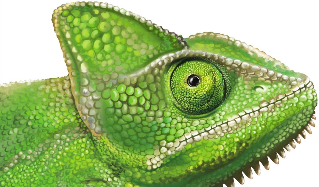 变色龙的眼睛向外鼓着,呈锥状,周围有环状的褶皱,可以灵活地伸缩。最特别的是,变色龙的两只眼睛可以独立向不同的方向转动,它可以在保持身体纹丝不动的情况下,清楚地看清周围的环境。