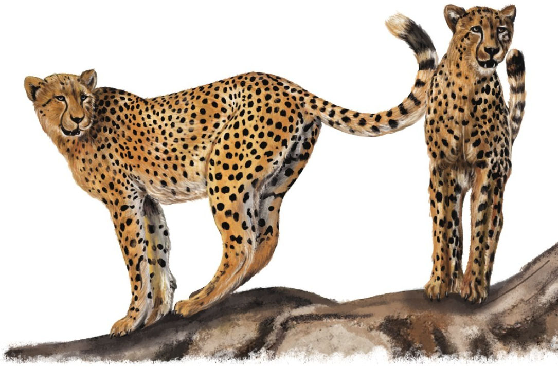 猎豹是非洲草原上最优秀的猎手。当发现猎物时,猎豹会迅速奔跑,以最快的速度将它捕获。很显然,在快速奔跑中牢牢地盯住猎物不是一件容易的事情。从猎豹的眼角沿鼻子两侧一直延伸至嘴角的两条黑色泪痕状毛发,对猎豹视物有很大的帮助。这两条“泪痕”可以减小太阳强光对眼睛的刺激,从而使猎豹的视野变得宽阔。而大尾巴起到了平衡作用,以防止摔倒。