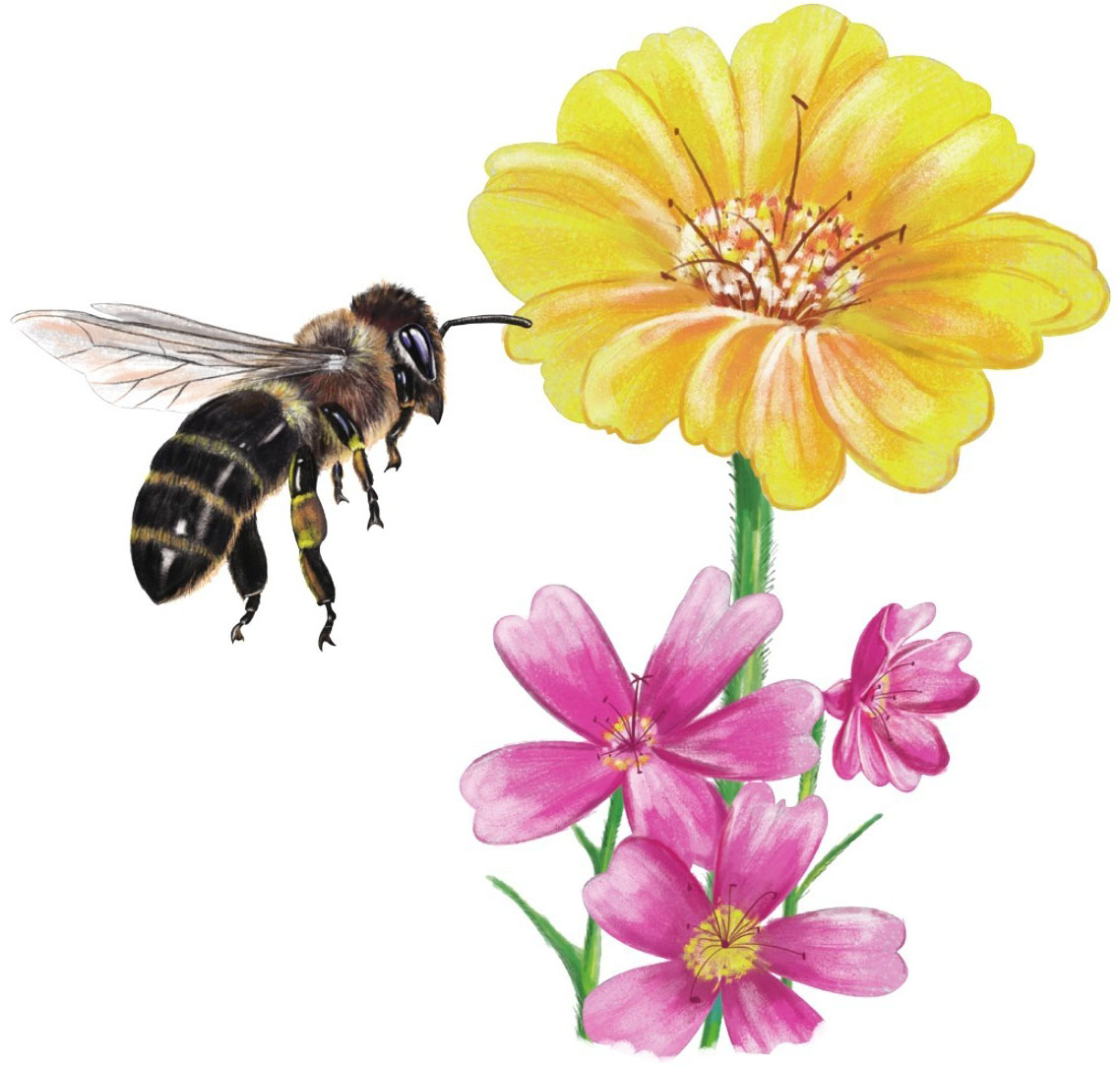 蜜蜂会对不同颜色的花朵做出反应,但它们眼中的颜色和人类所见不同:人类眼中的绿色在蜜蜂的眼中是白色的;人类眼中的红色在蜜蜂的眼中是黑色或深灰色的;人类眼中的白色在蜜蜂的眼中却是蓝色或蓝绿色的。