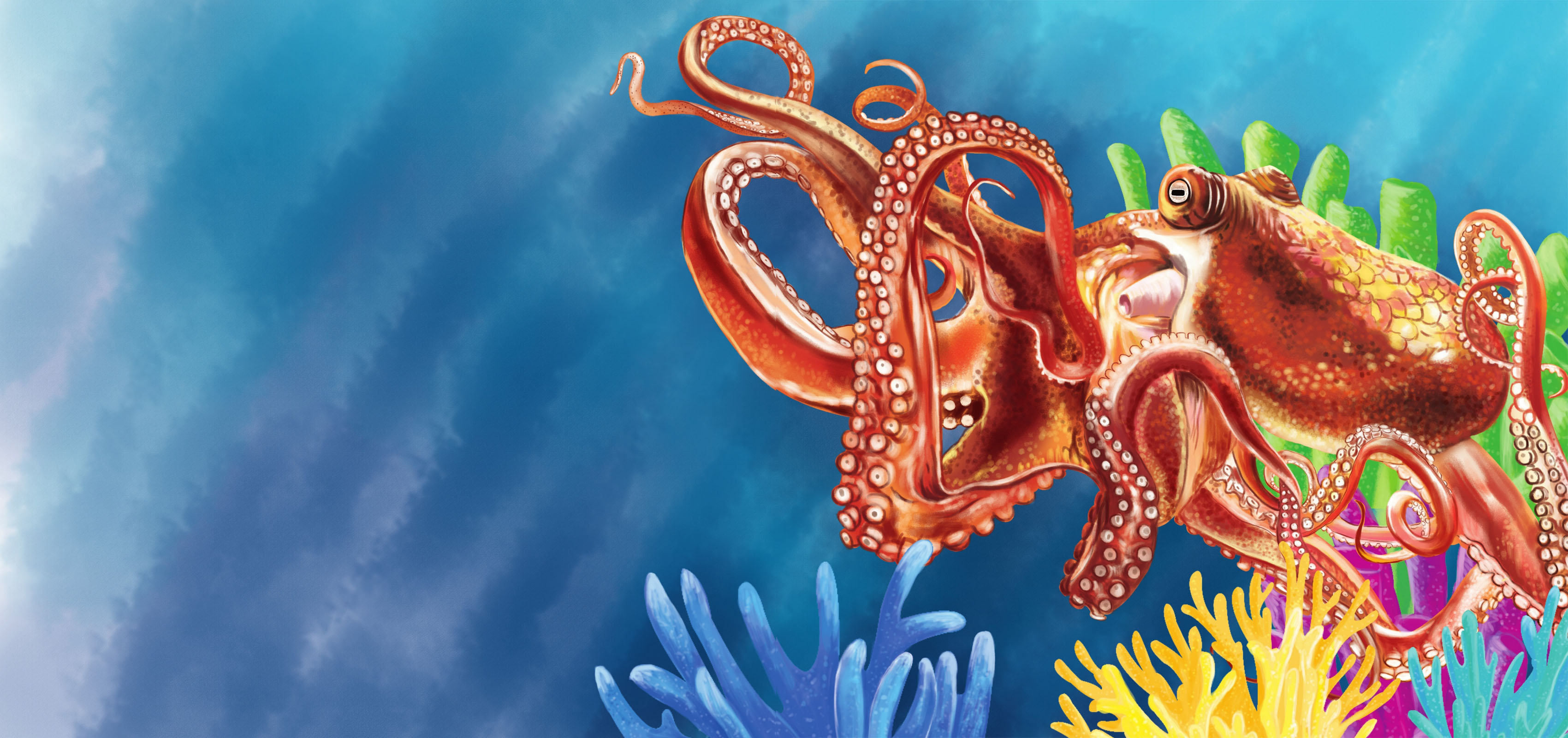 在无脊椎动物家族中,章鱼的眼睛进化得最完美。和人类的眼睛差不多,章鱼也能够辨别出五颜六色,所以它看到的世界是彩色的。章鱼是很会伪装和拟态的动物,所以看清环境和分辨出周围的颜色很重要。