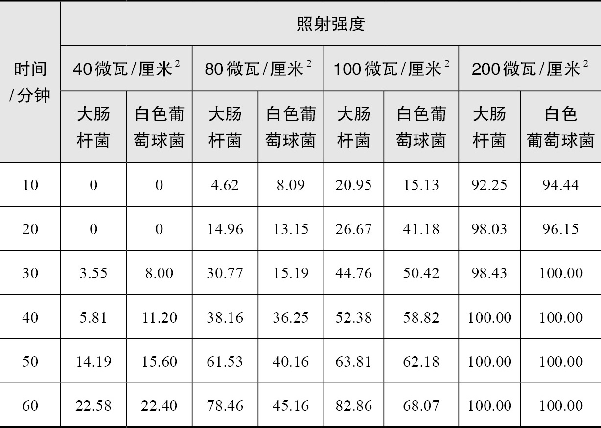 表2-4 不同照射强度和时间对大肠杆菌和白色葡萄球菌杀菌率的影响 单位:%