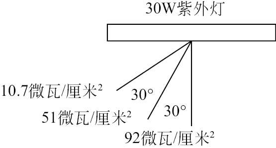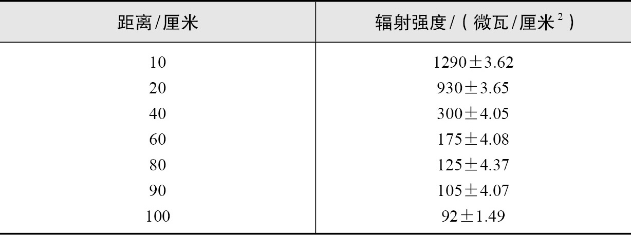 (4)距离对紫外灯辐射强度的影响 受照物与紫外灯的距离越远,辐射强度越低。30瓦石英紫外灯距离与辐射强度的关系见表2-3。