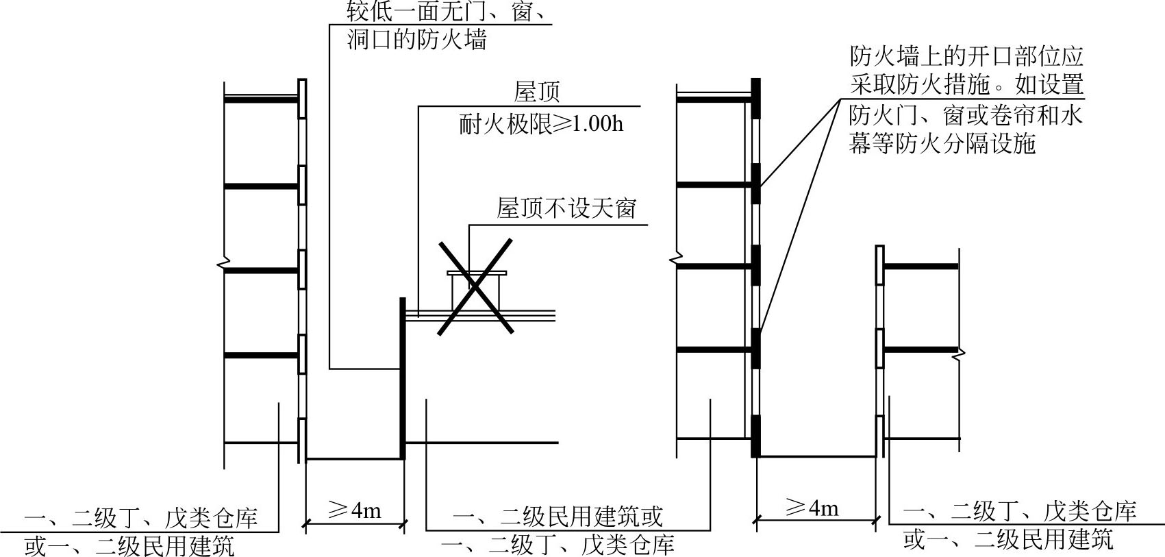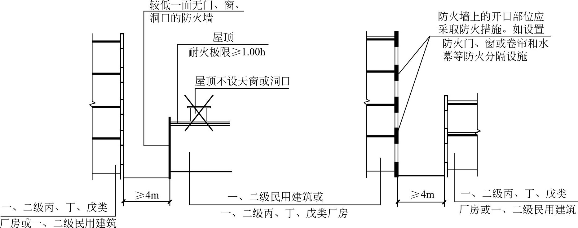 ②相邻较低一面外墙为防火墙,且屋顶无天窗或洞口、屋顶耐火极限不低于1.00h,或相邻较高一面外墙为防火墙,且墙上开口部位采取了防火措施,其防火间距可适当减小,但不应小于4m,如图2-16所示。