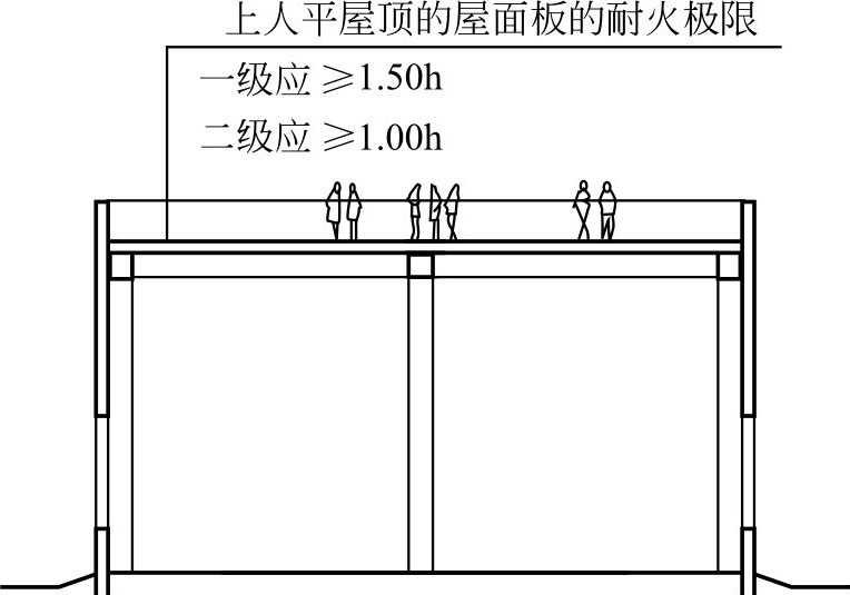 一、二级耐火等级厂房(仓库)的上人平屋顶,其屋面板的耐火极限分别不应低于1.50h和1.00h,如图2-3所示。