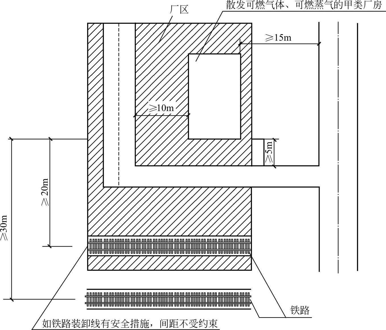 (3)散发可燃气体、可燃蒸气的甲类厂房与铁路、道路等的防火间距不应小于表2-9的规定,但甲类厂房所属厂内铁路装卸线当有安全措施时,防火间距不受表2-9规定的限制,如图2-9所示。
