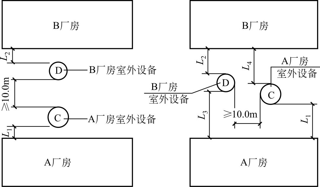 L 1 、 L 2 —室外设备C、D外壁分别与A、B厂房的间距; L 3 、 L 4 —室外设备C、D外壁与相邻其他厂房之间的距离