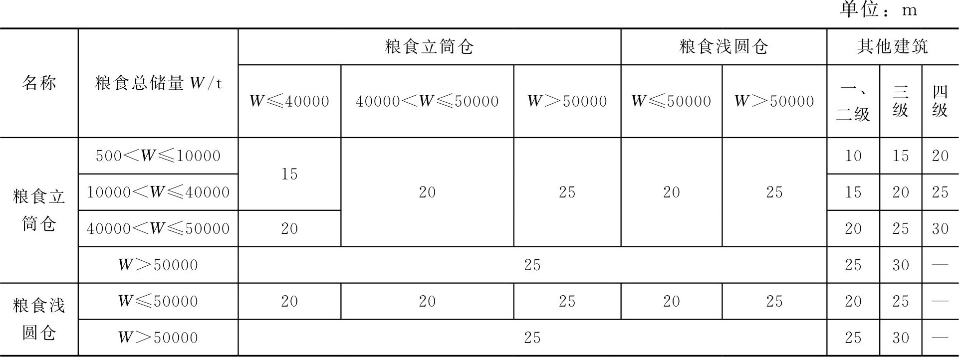 表2-12 粮食筒仓与其他建筑、粮食筒仓组之间的防火间距
