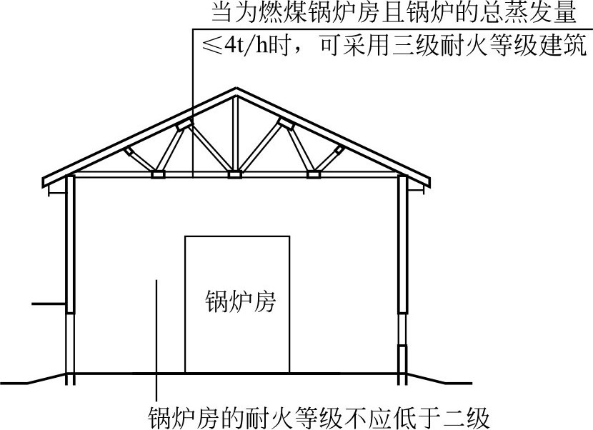 ⑤锅炉房的耐火等级不应低于二级,当为燃煤锅炉房且锅炉的总蒸发量不大于4t/h时,可采用三级耐火等级的建筑,如图2-2所示。