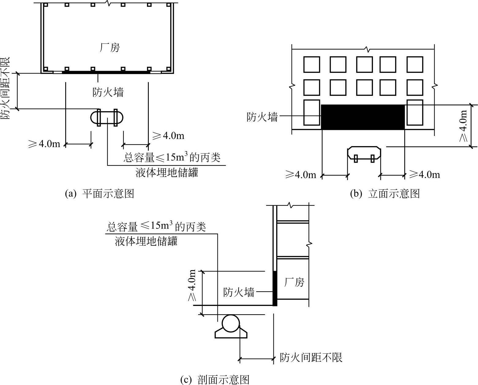 总容量不大于15m 3 的丙类液体储罐,当直埋于厂房外墙外,且面向储罐一面4.0m范围内的外墙为防火墙时,其防火间距可不限,如图2-13所示。